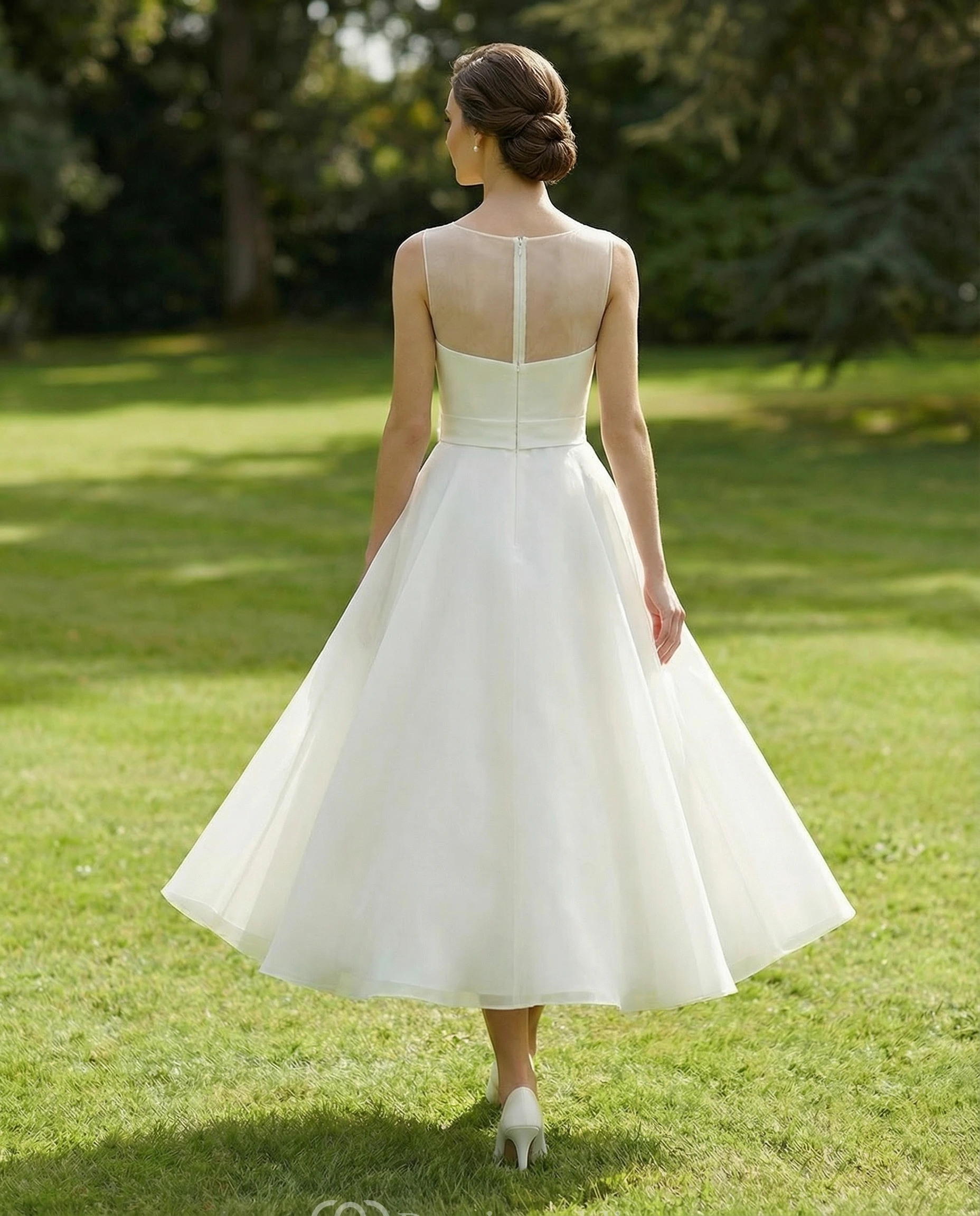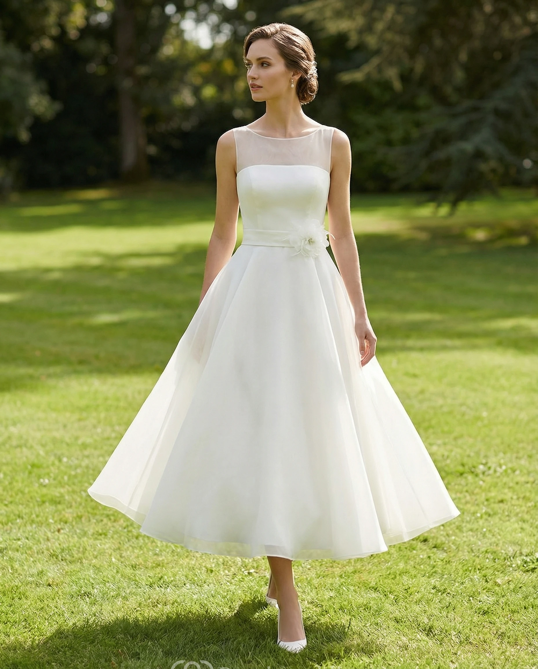 Floral Detail Tea-Length Illusion Neck Wedding Dress