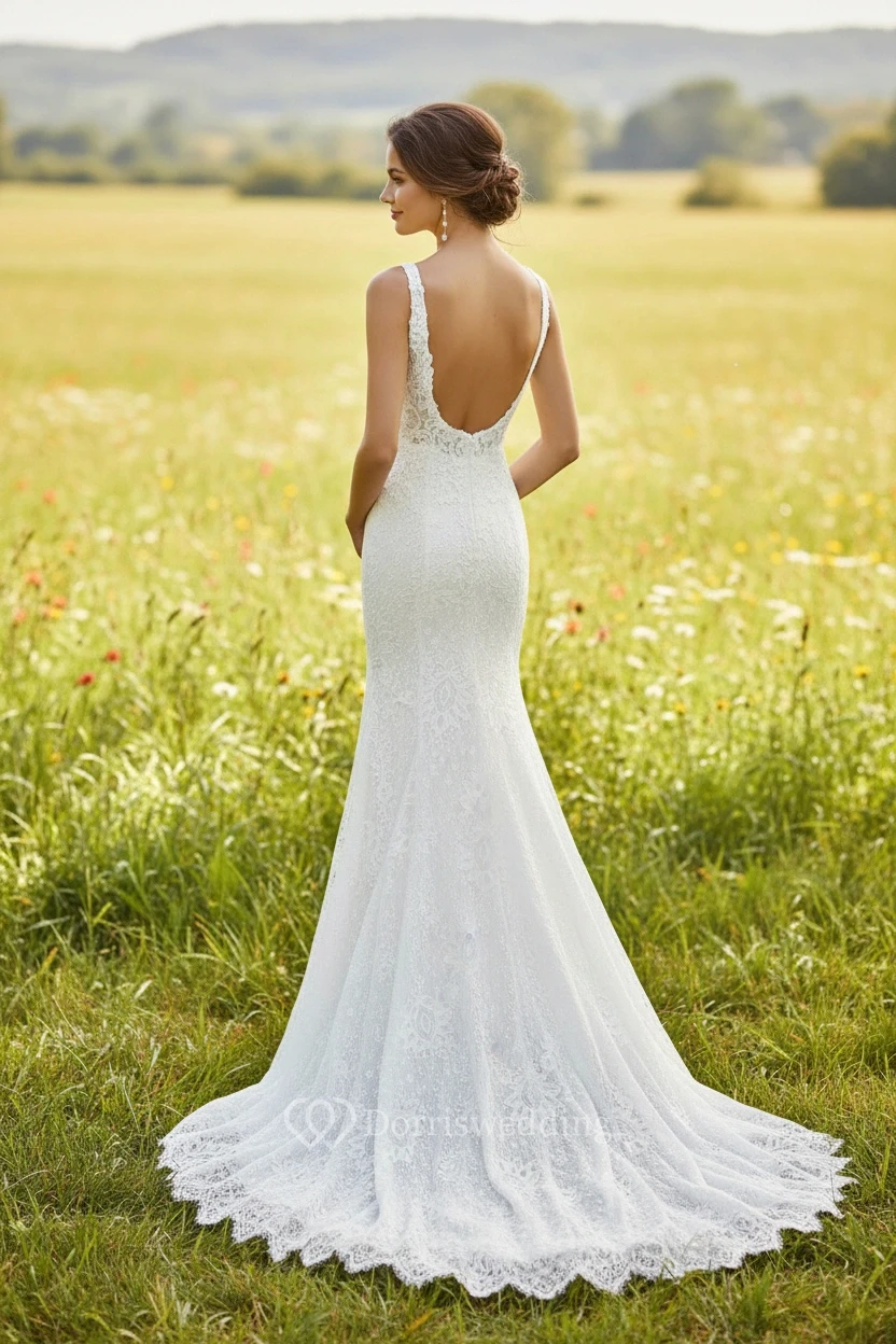 This dress is everything I wanted. The sleeveless V-neck is very flattering for my shoulders and the lace is high quality. The train is just perfect.