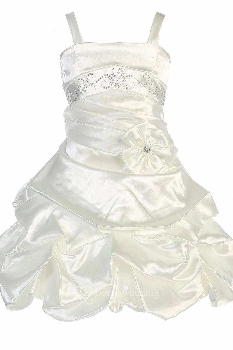 Floral Midi Beaded Pleated Satin Flower Girl Dress With Tiers