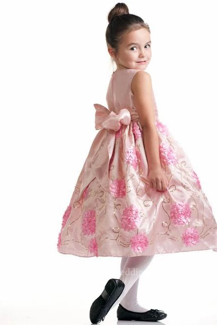 Floral Tea-Length Bowed Flower Girl Dress With Embroidery