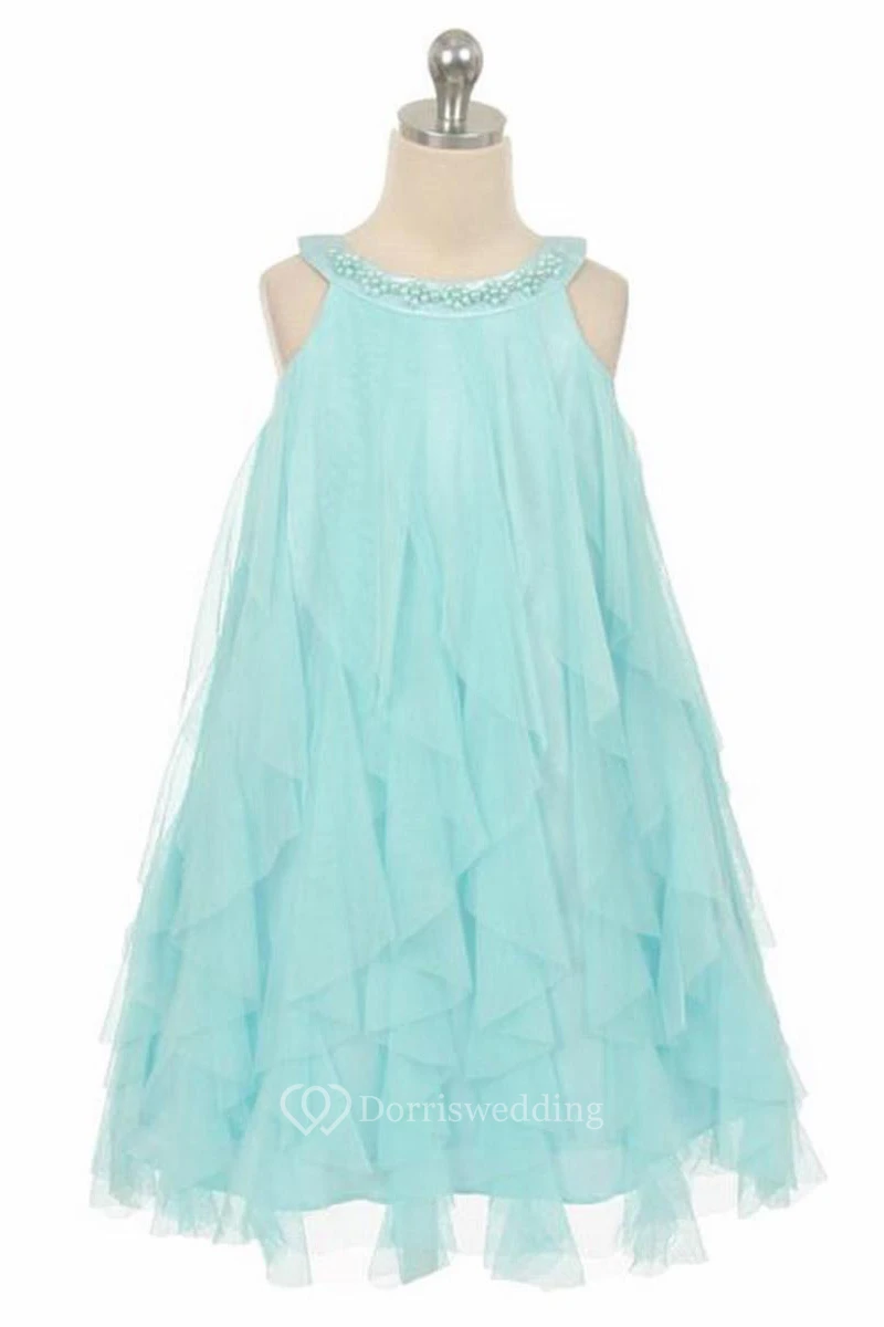 Floral Tea-Length Floral Beaded Satin Flower Girl Dress With Ruffles