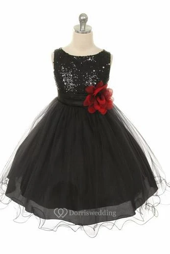 Floral Tea-Length Floral Sequins&Satin Flower Girl Dress With Sash