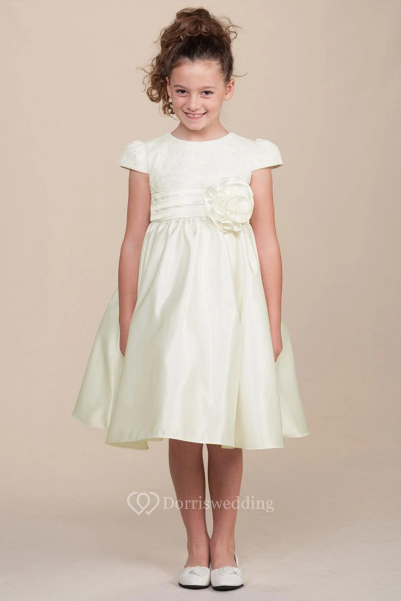 Floral Tea-Length Tiered Cap-Sleeve Lace&Satin Flower Girl Dress