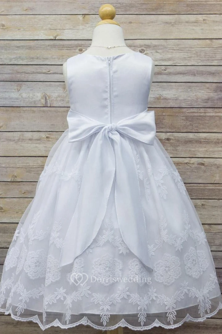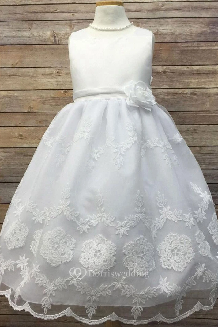 Floral Tea-Length Tiered Organza&Satin Flower Girl Dress With Embroidery