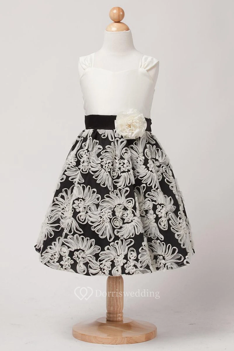 Floral Tea-Length Tiered Satin Flower Girl Dress With Embroidery