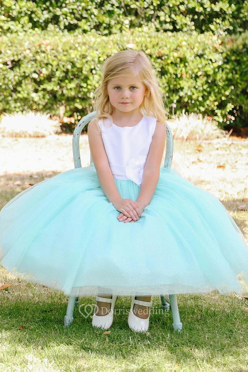 Floral Tea-Length Tiered Tulle&Satin Flower Girl Dress With Embroidery