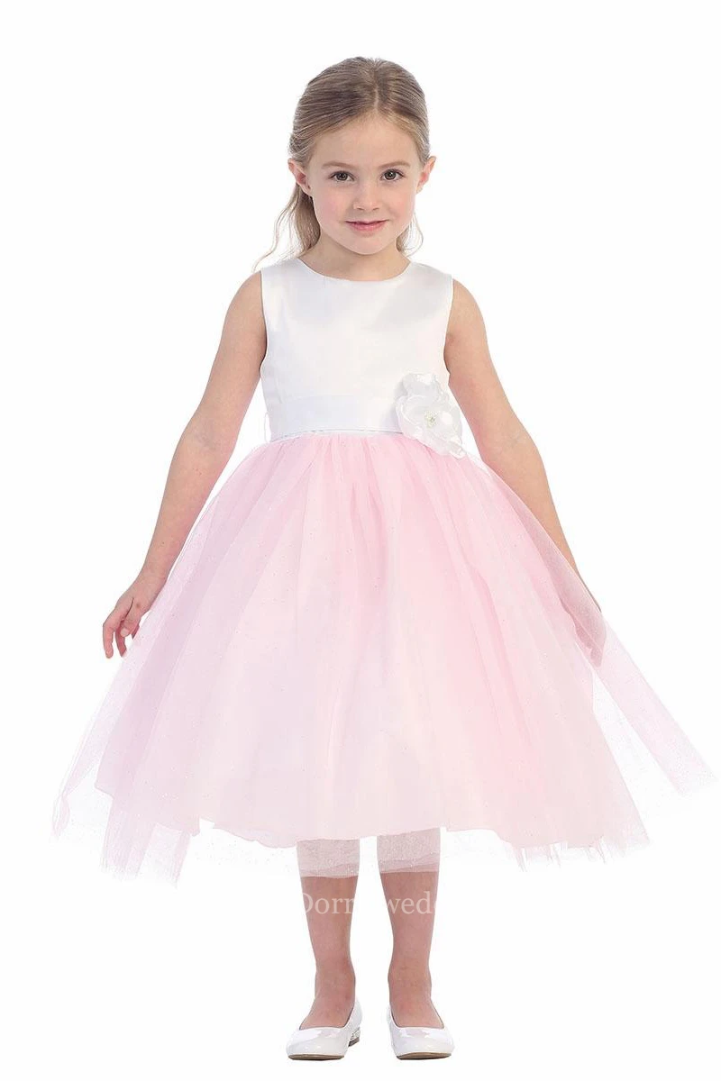 Floral Tea-Length Tiered Tulle&Satin Flower Girl Dress With Embroidery