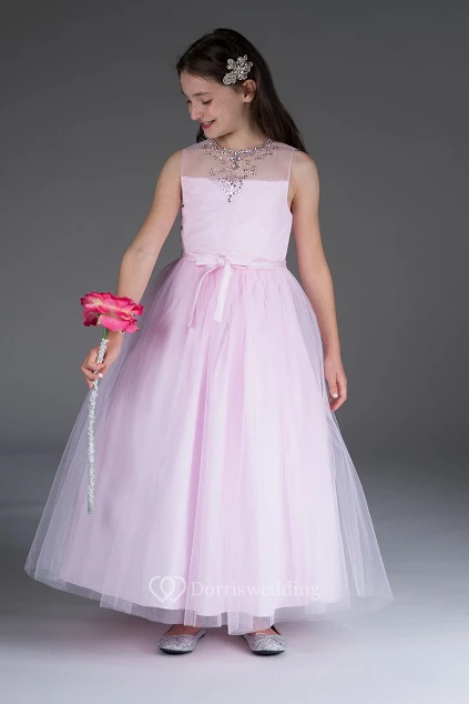 Flower Girl Beading Neck Tulle Ball Gown With Bow Sash And Sequins