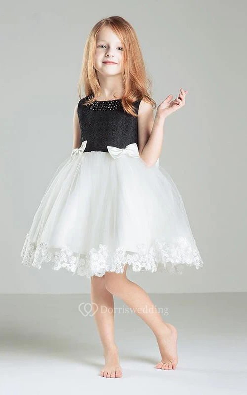 Flower Girl Beading Neck Tulle Short Dress With Lace And Bow