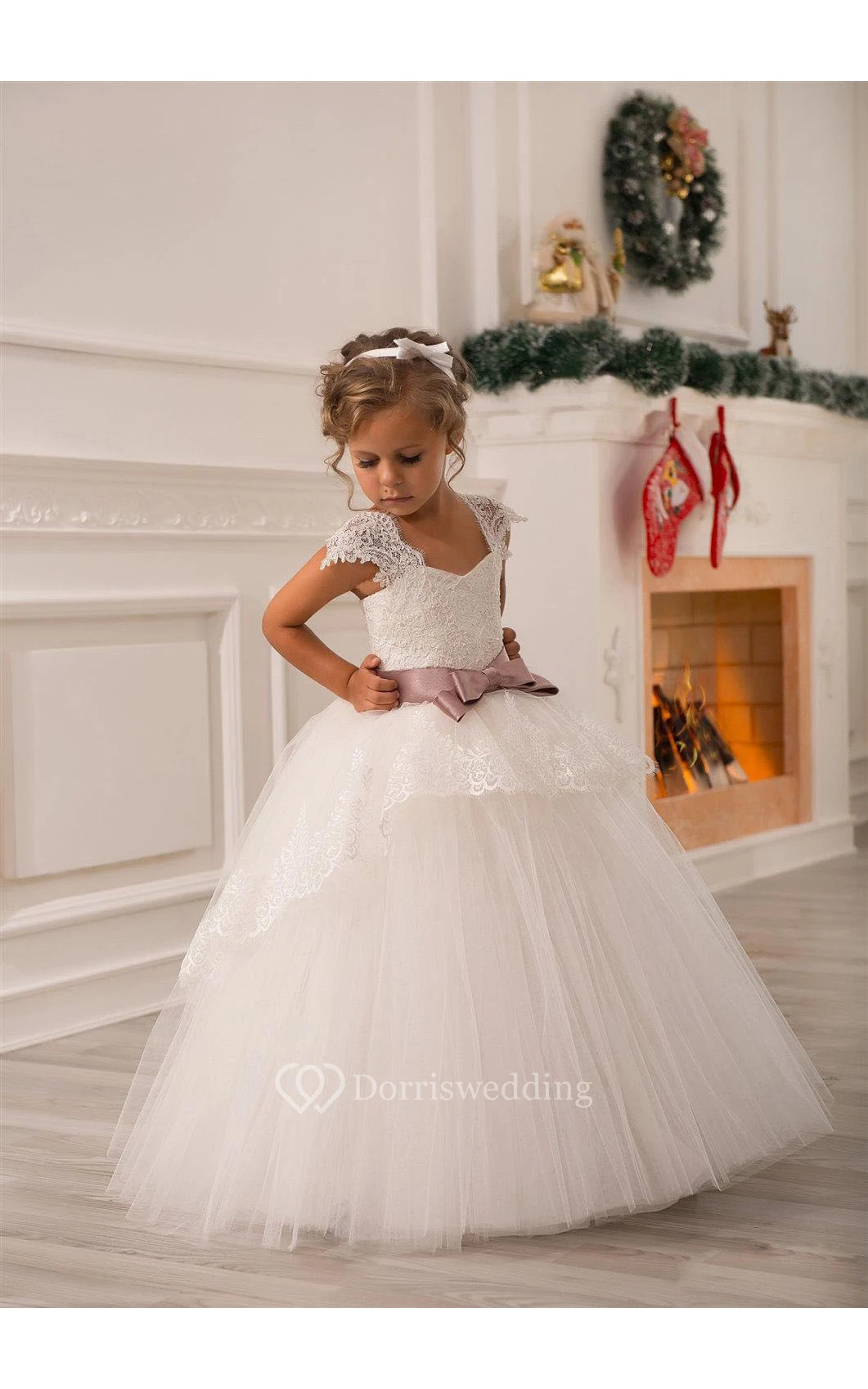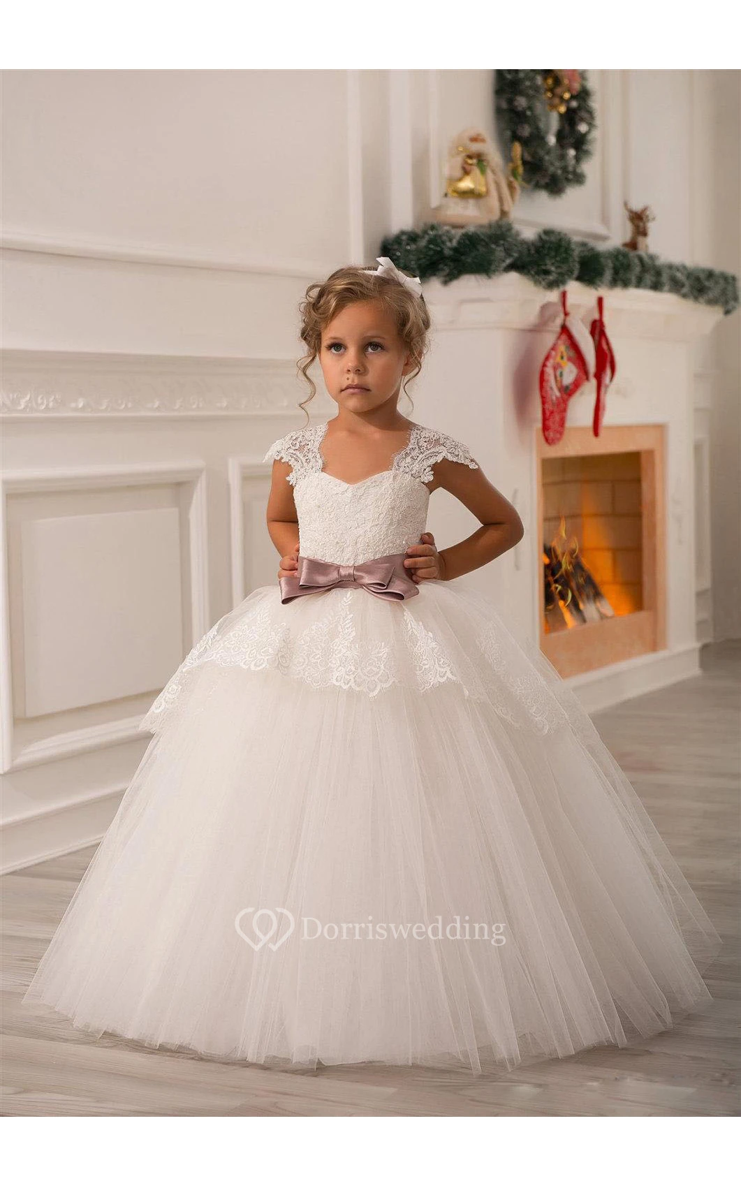 Flower Girl Cap Sleeve Tulle Ball Gown With Lace Up and Bow
