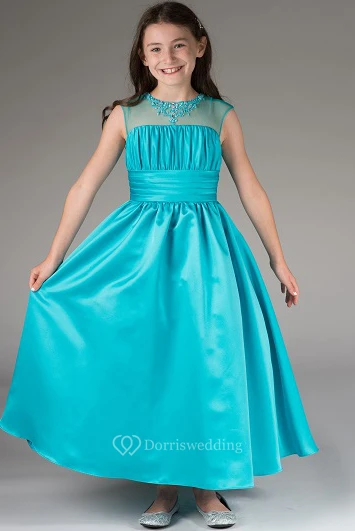 Flower Girl Crystal Neck Cap Sleeve Taffeta Ankle Length Dress With Bandage