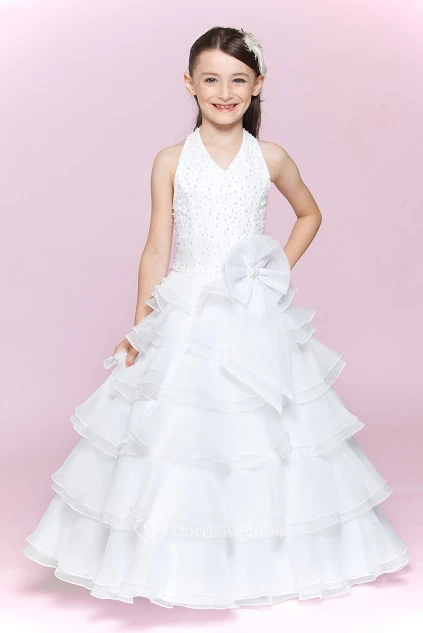Flower Girl Halter A-line Layered Organza Long Dress With Waist Flower