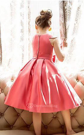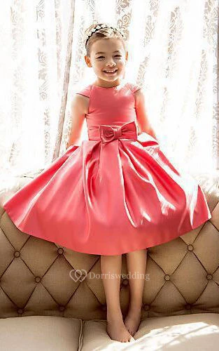 Flower Girl Jewel Neck Cap Sleeve Pleated Satin Gown With Bow