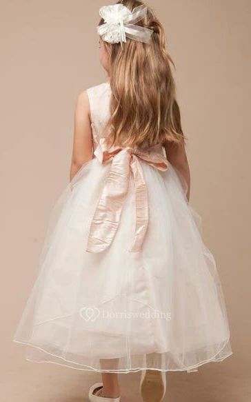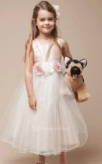 Flower Girl Jewel Neck Empire Tulle Ball Gown With Floral Sash