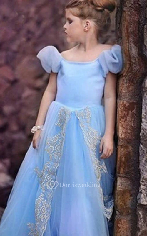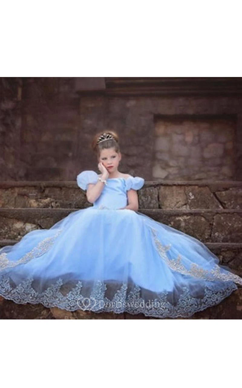 Flower Girl Off-the-shoulder Tulle Ball Gown With Puff Sleeve