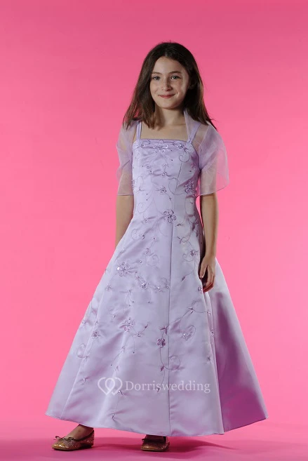 Flower Girl Organza Sleeve A-line Satin Long Dress With Embroidery