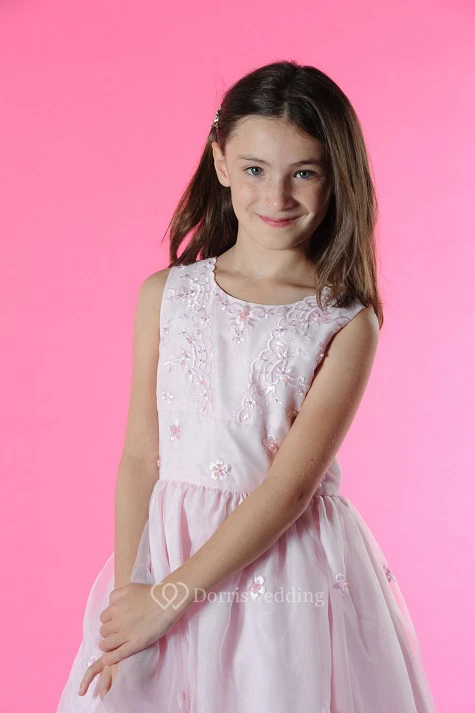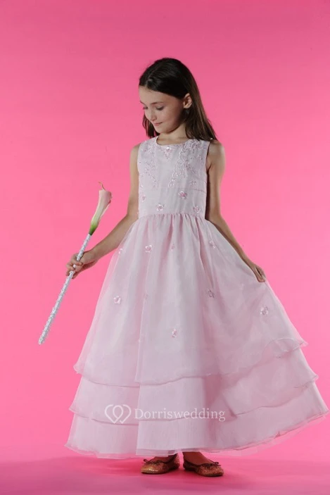 Flower Girl Scoop Neck A-line Layered Tulle Long Dress With Embroidery