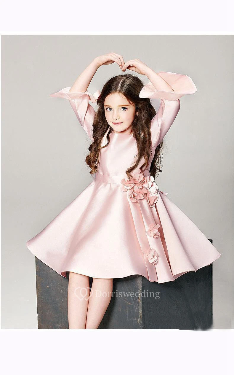 Flower Girl Scoop Neck Bell Sleeve A-line Satin Short Dress