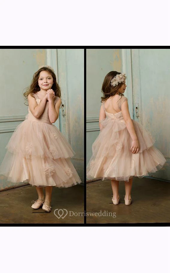 Flower Girl Straps Layered Tulle Ball Gown With Flowers