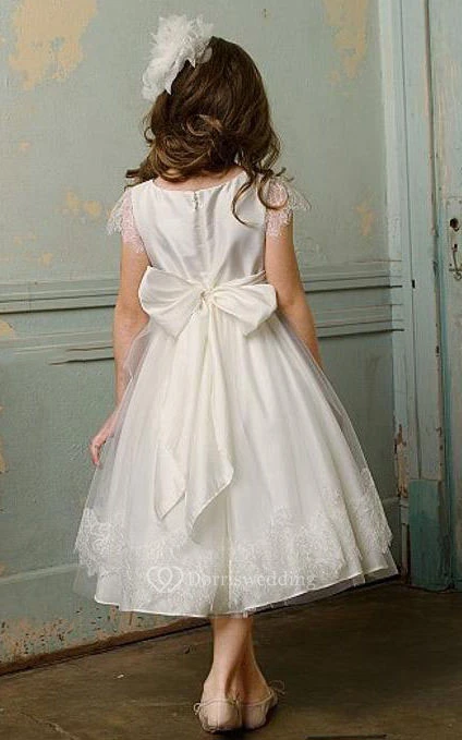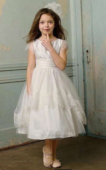 Flower Girl Tulle Cap Sleeve Taffeta Ball Gown With Sash