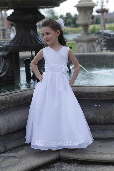 Flower Girl V Neck A-line Long Dress With Waist Flower