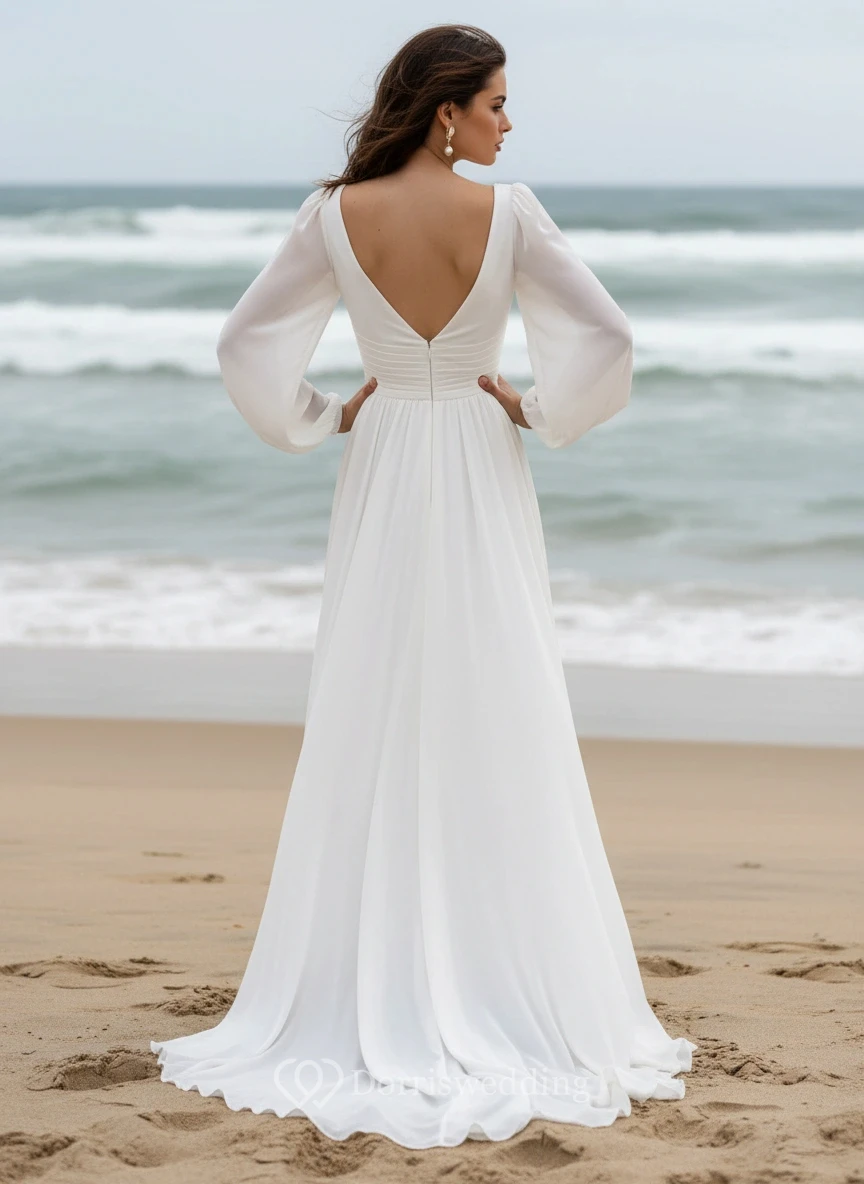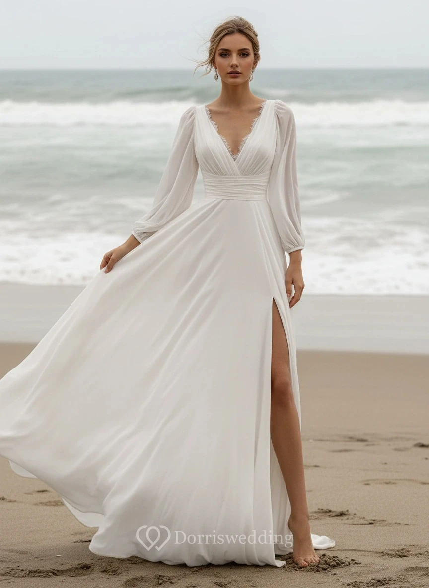 Flowy Chiffon V-Neck Long Sleeve High-Slit Beach Wedding Dress