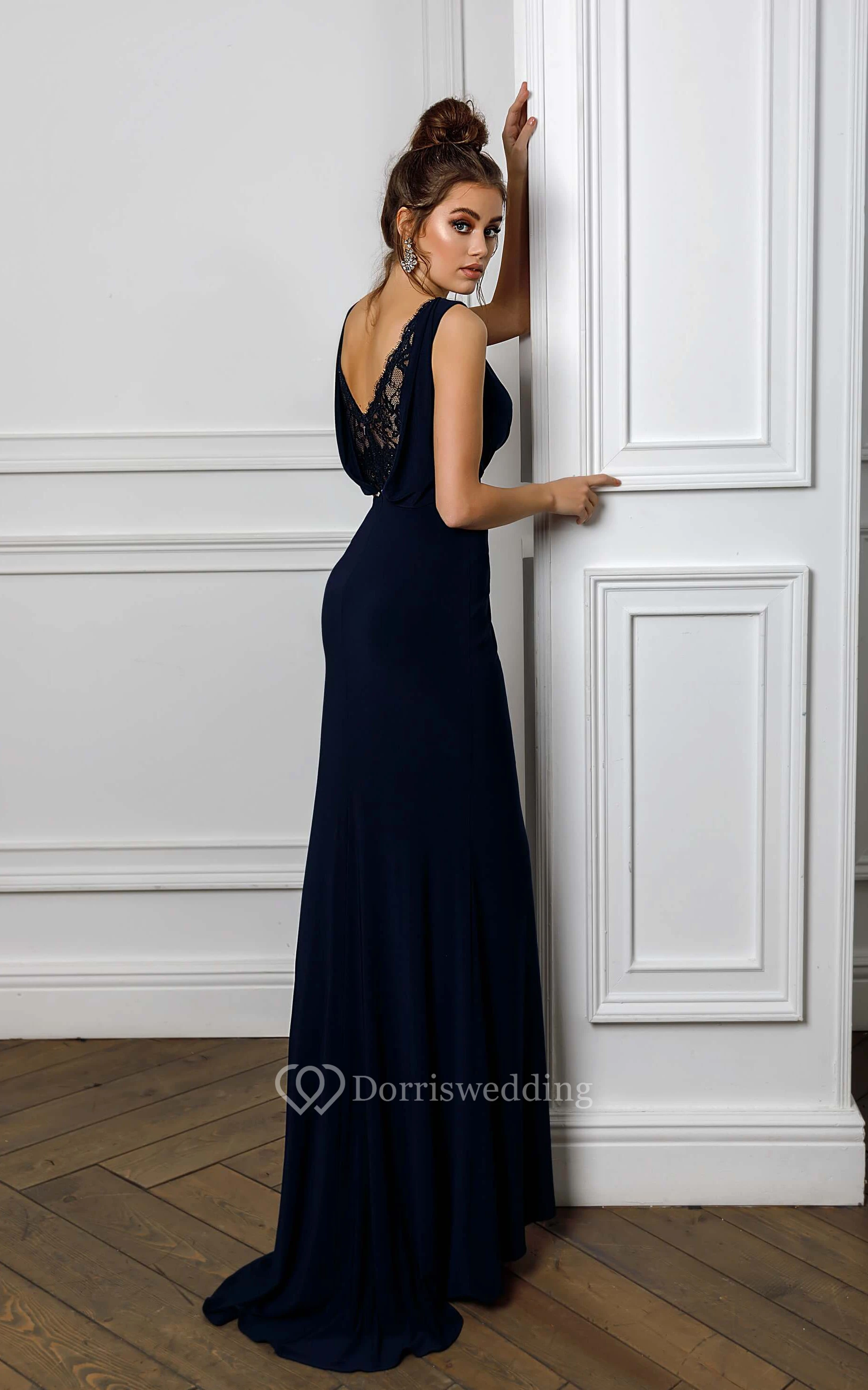 Formal V-neck Sleeveless Empire Front Split Sheath Evening Dress with Beaded Waist