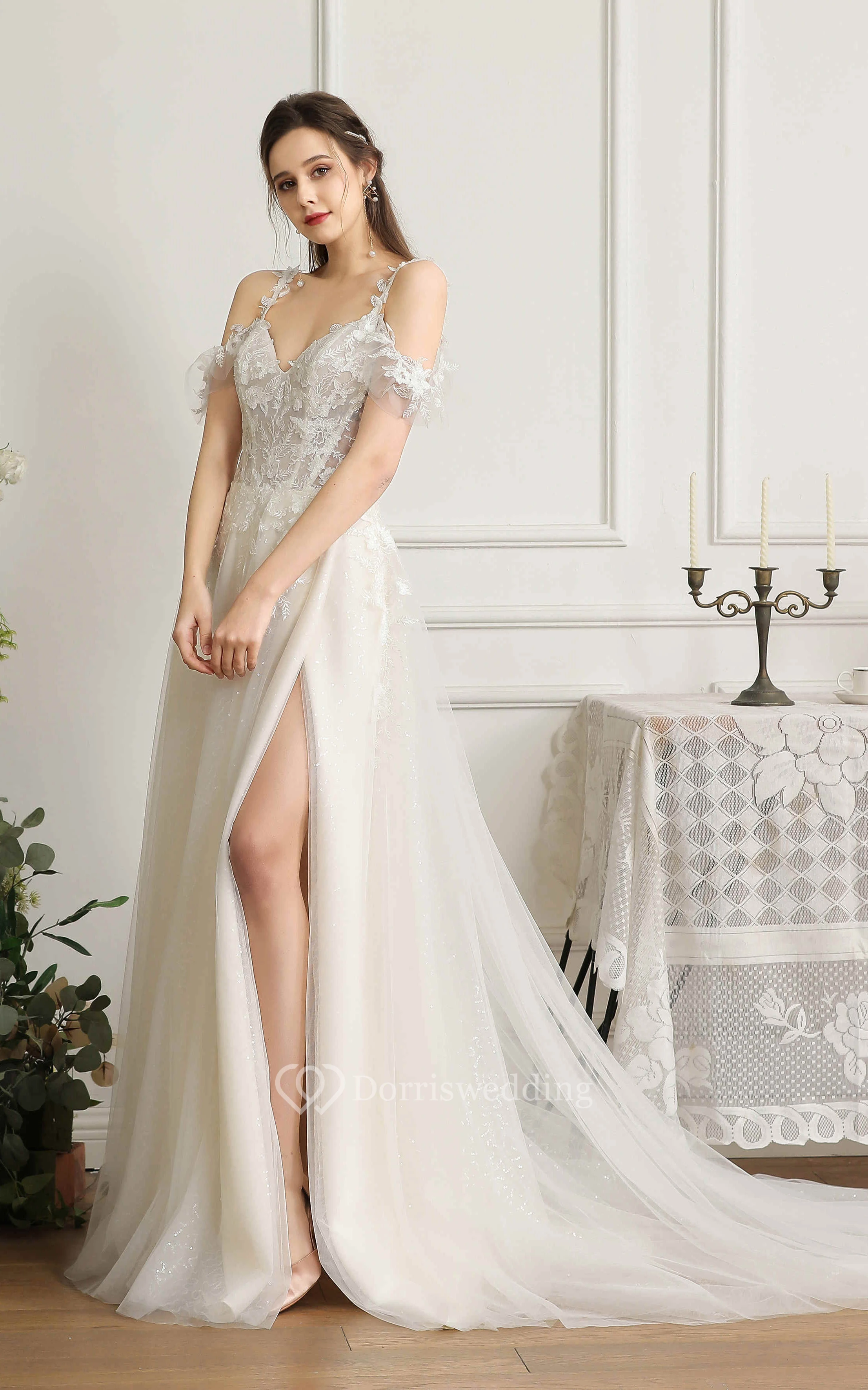 Front Split Sexy Wedding Dress With Straps And Off-the-shoulder sleeves With Boning And Lace Appliques