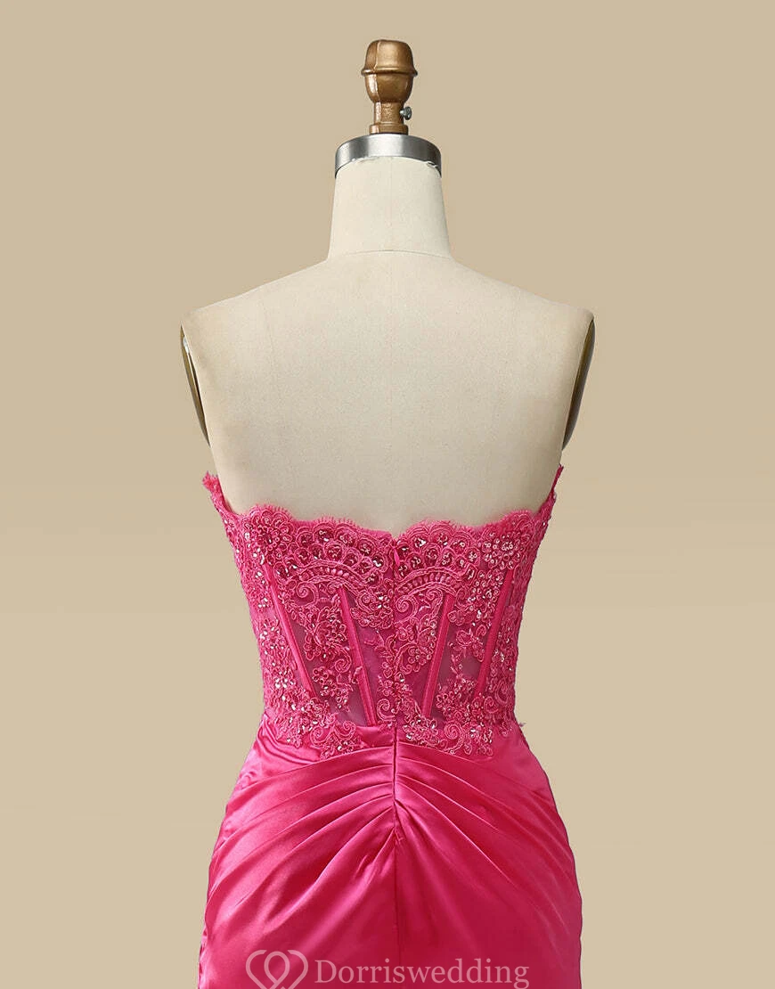 Bold fuchsia corset gown featuring a sheer boned bodice with floral sequin appliqués, sweetheart neckline, draped stretch skirt with thigh‐high slit and sweep train.