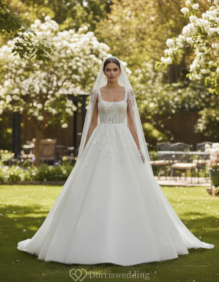 This elegant garden wedding dress features a lace bodice with a matching bolero and a long veil. Set in a lush garden with white flowering trees and outdoor furniture, it creates a formal yet romantic atmosphere for a garden wedding ceremony.