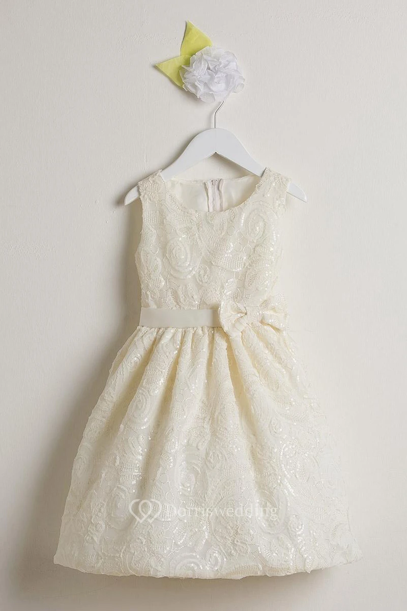 Embroideried Knee-Length Tiered Bowed Sequins&Satin Flower Girl Dress With Sash