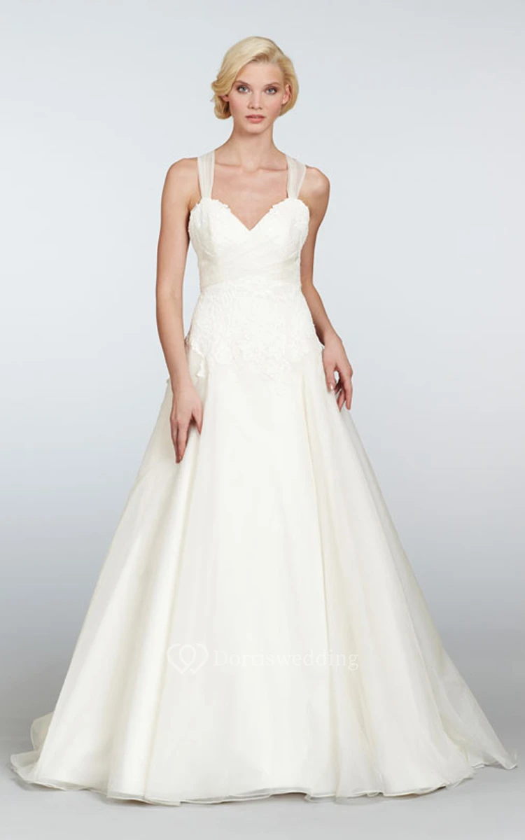 This stupefying wedding gown features a feminine sweetheart neckline on semi-transparent tulle straps crisscrossed on the back and tied in a gentle bow detail. Lace bodice forms an artistic shaped lowered waistline. Fantastic organza A-line skirt gracefully drapes to the feet where it forms a finely hemmed chapel train.