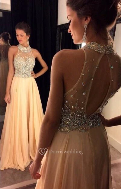 Glamorous High Neck Beadings Crystals Evening Dress A-line Zipper
