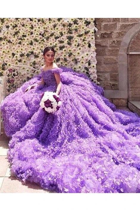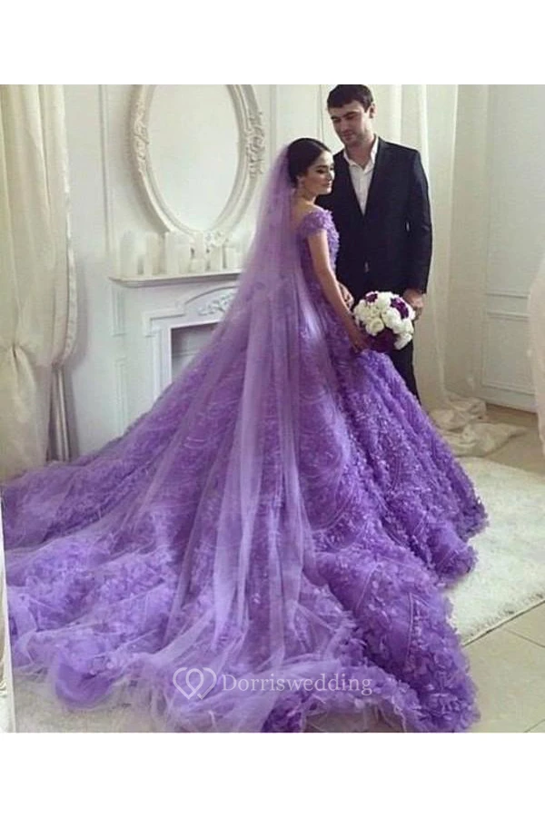 Glamorous Purple Off-the-shoulder Wedding Dress Long Train Flowers