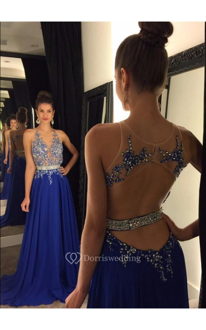 Glamorous Royal Blue Lace Appliques Prom Dress Beadings Chiffon A-line