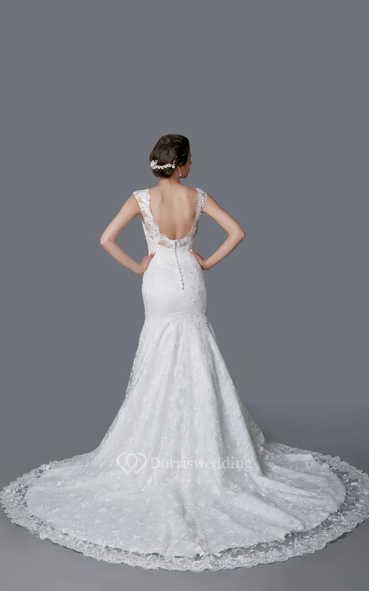This glamourous wedding dress is sure to make a statement. The mermaid dress is form-fitting until just above the knee, where is falls into a gorgeous floor-length skirt with a court train. The dress features a scoop neck in the front with short, lace sleeves, and a deep V in the back. All edges are framed with a delicate, scalloped lace design.