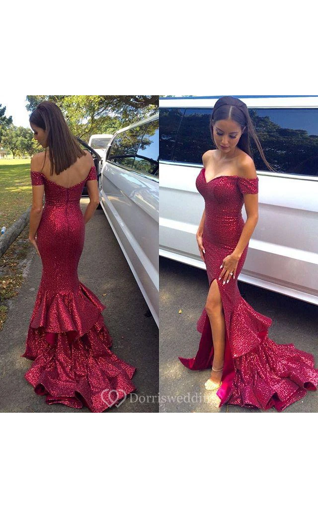 Glamorous Sequined Mermaid Ruffles Prom Dress Front Split Off-the-shoulder