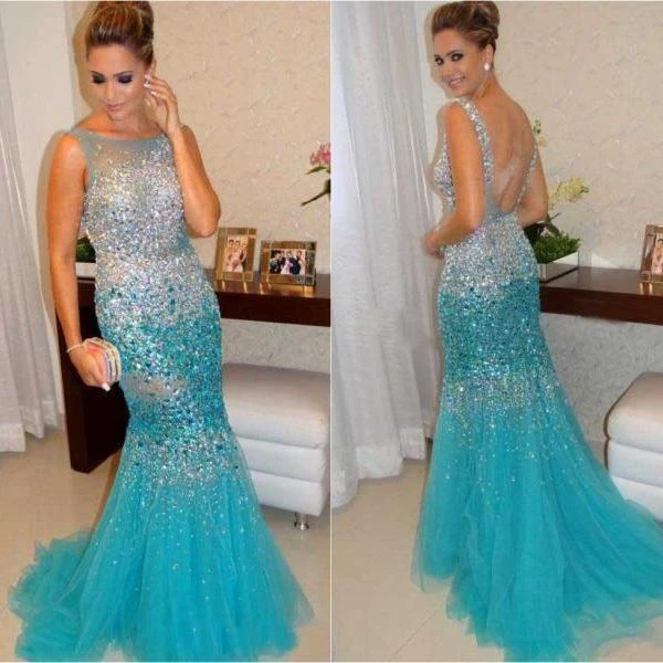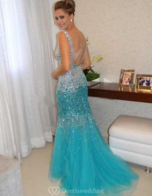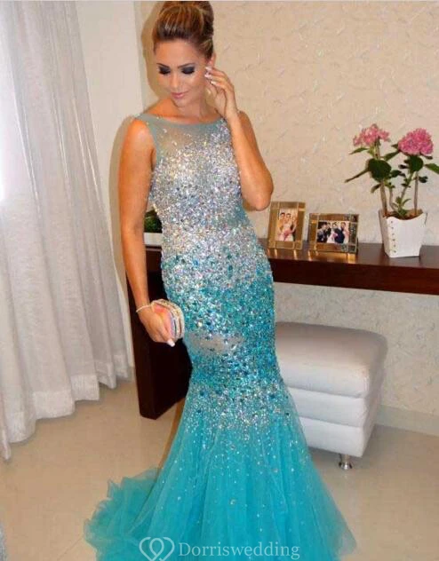 Glamorous Sleeveless Beadings Crystals Prom Dresses Mermaid Tulle Party Gowns