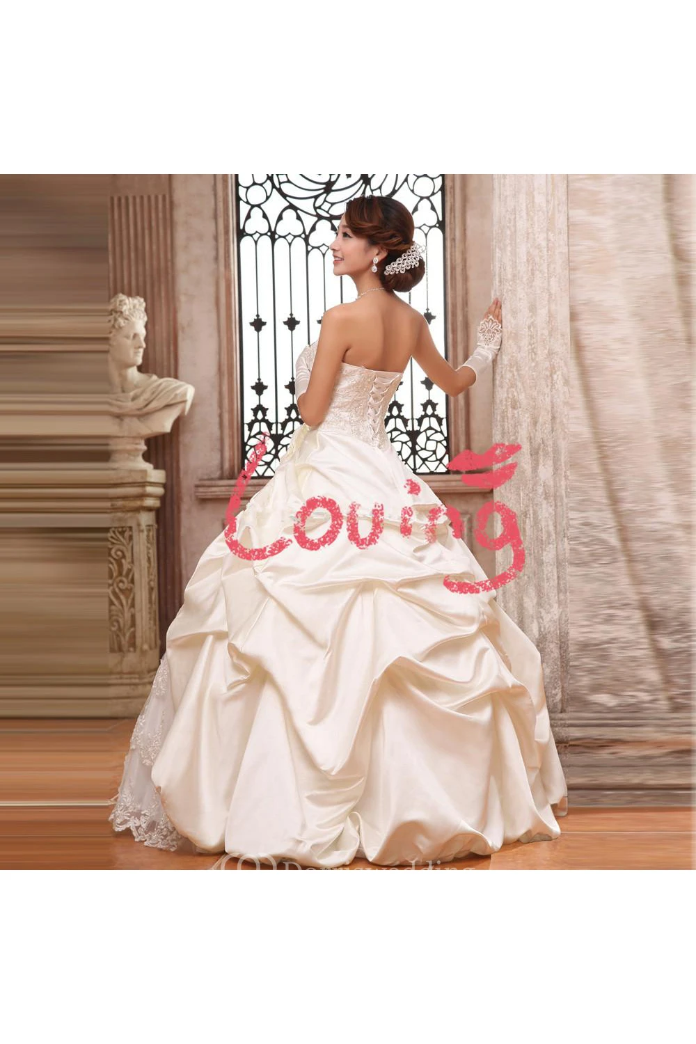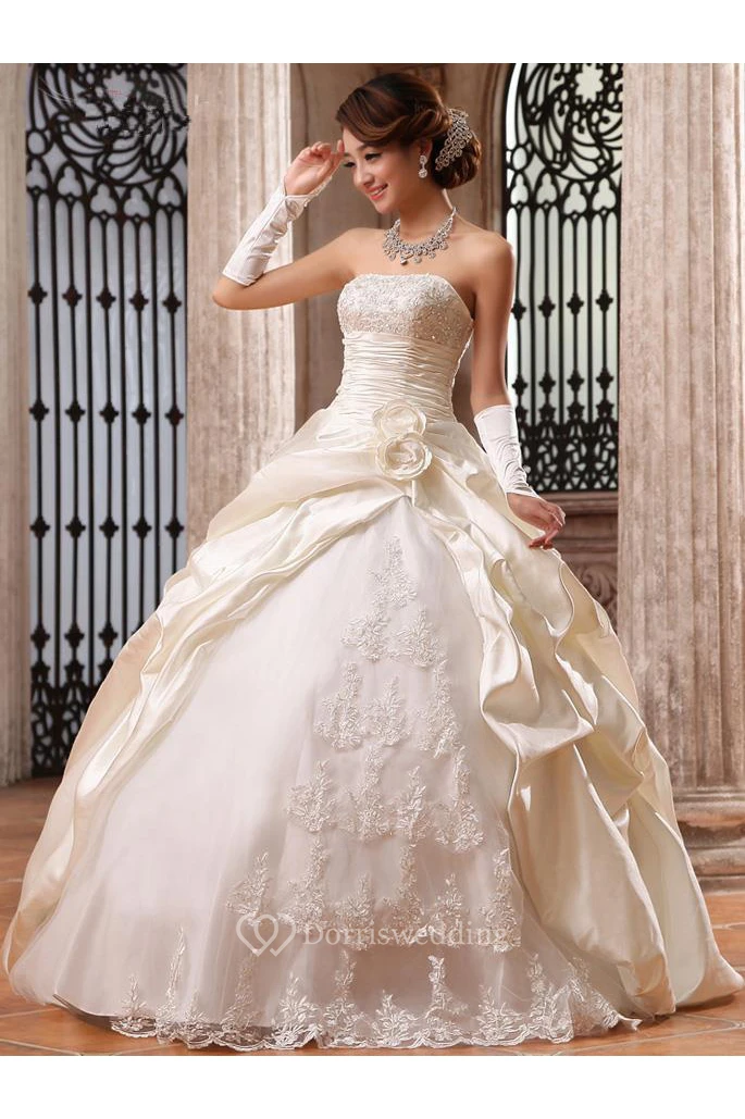 Glamorous Strapless Lace Appliques Taffeta Wedding Dresses Ball Gown