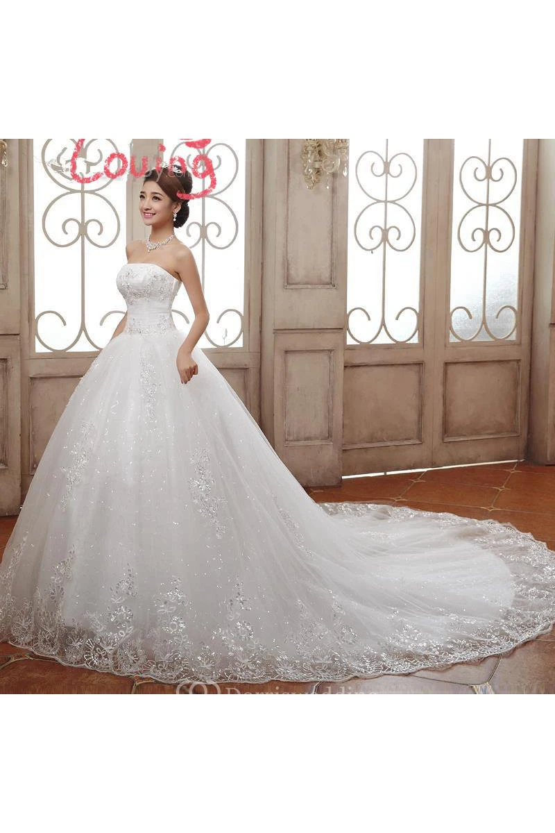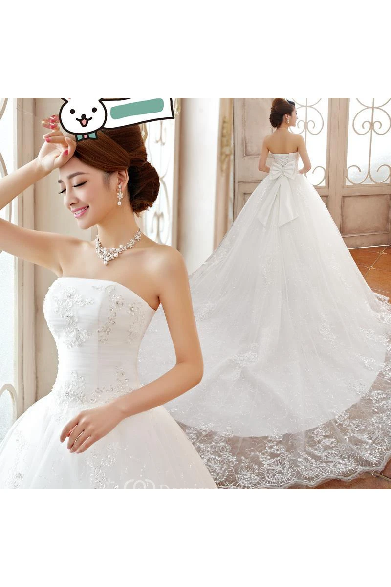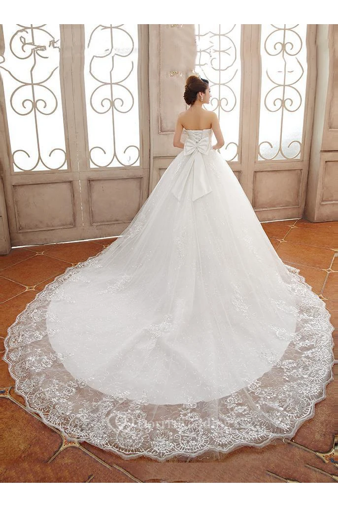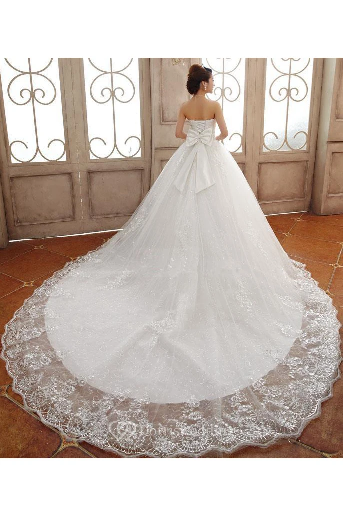 Glamorous Strapless Lace Beadings Wedding Dress Long Train Lace-Yp