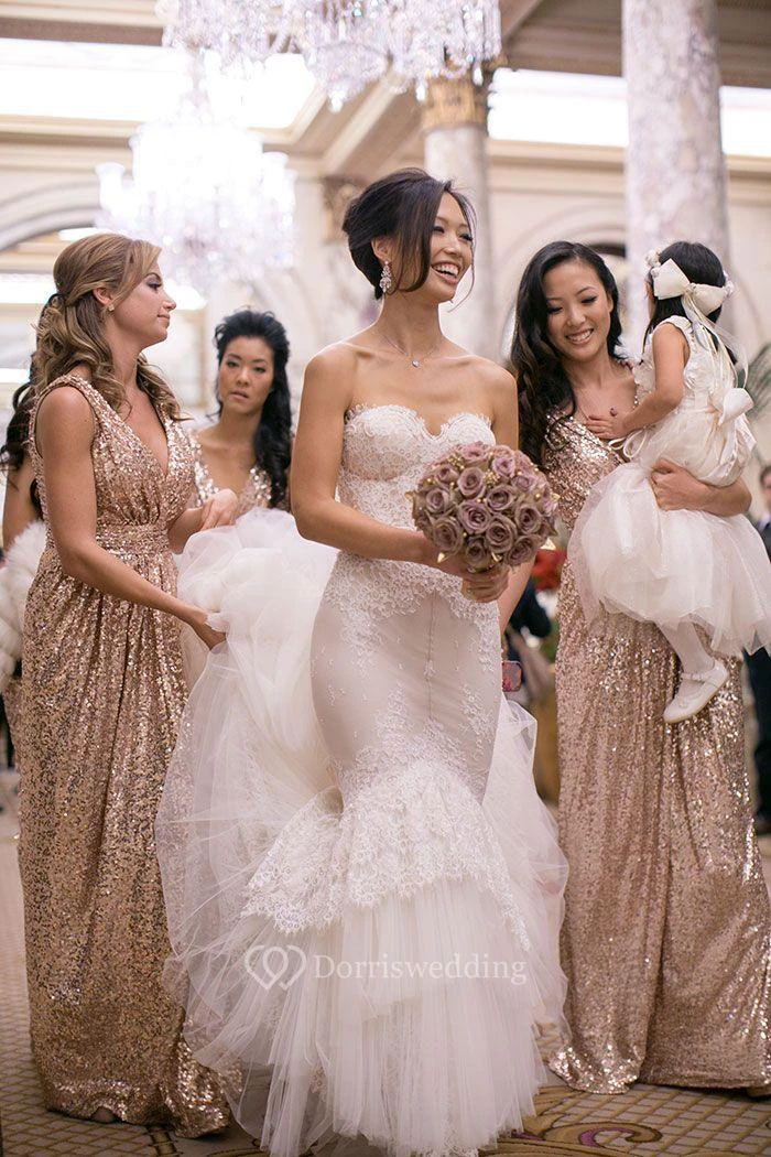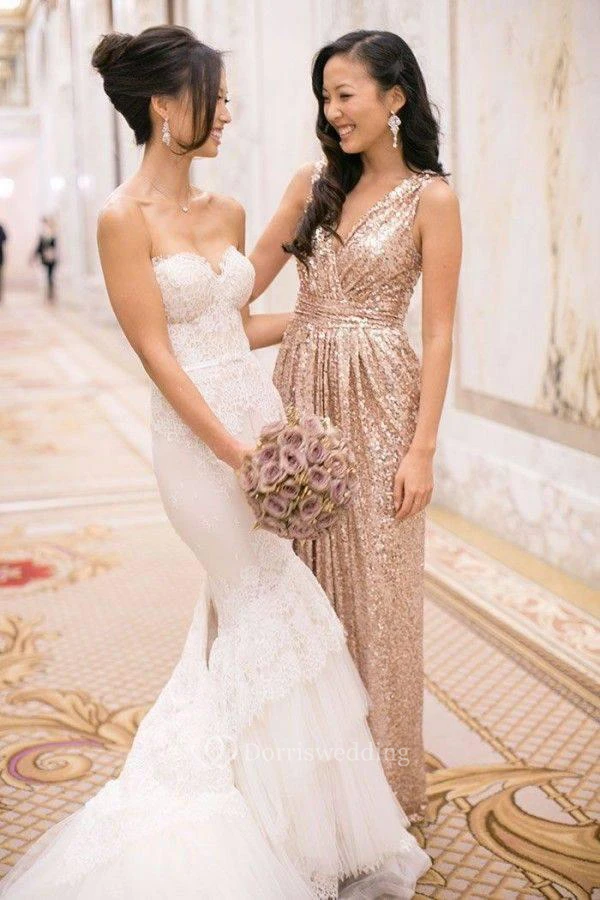 Glamorous V-neck Sleeveless Bridesmaid Dress Floor-longth With Sequins
