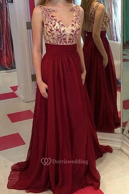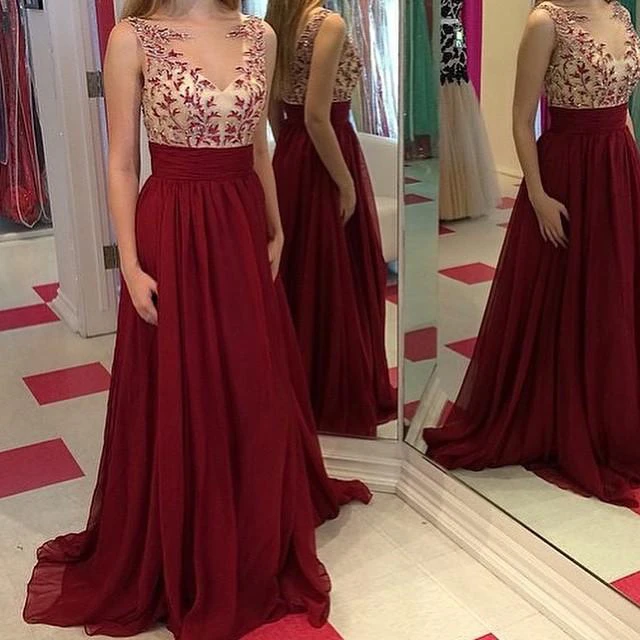 Gorgeous Burgundy Sleeveless Prom Dresses Long Chiffon Appliques Party Gowns