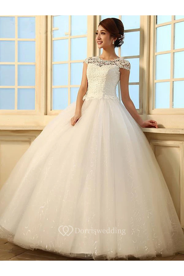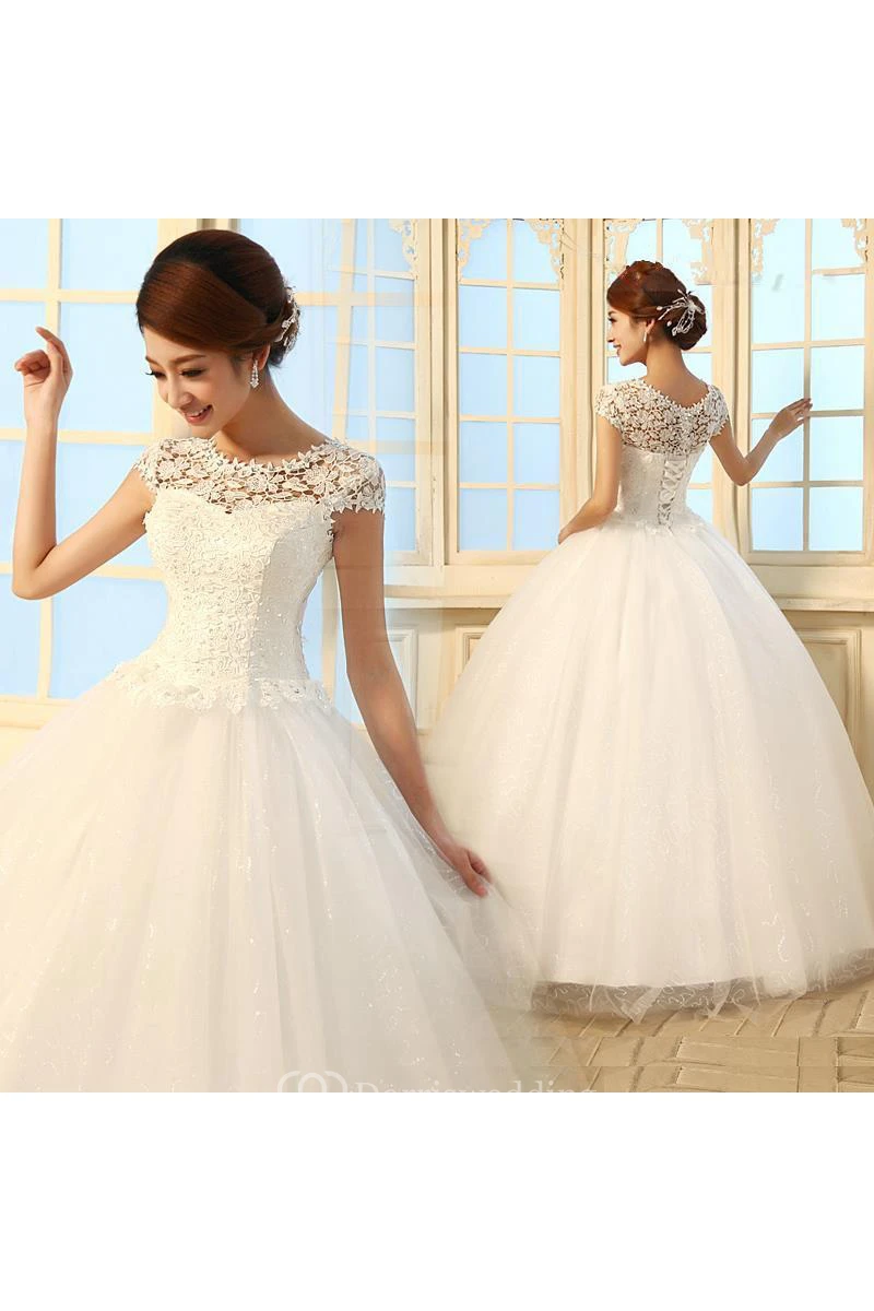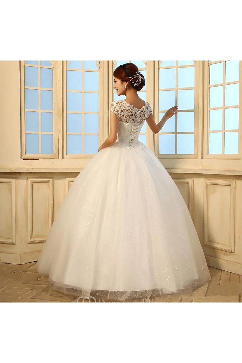 Gorgeous Cap Sleeve Lace Ball Gown Tulle Wedding Dresses Lace-up