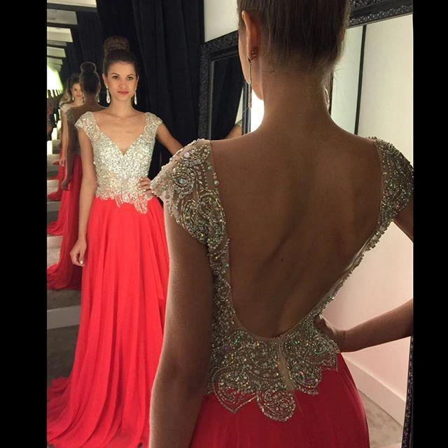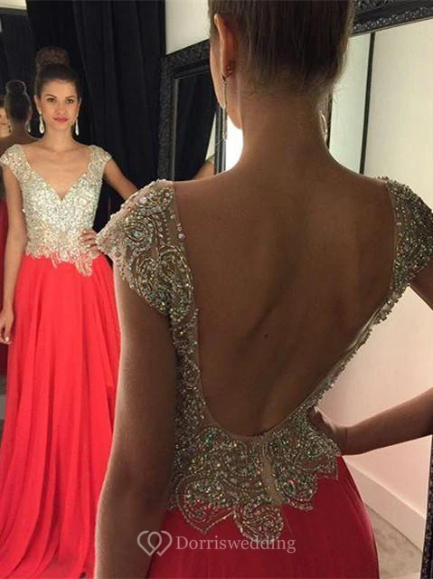 Gorgeous Crystal Open Back Evening Dress Cap Sleeve Long Chiffon Prom Gown