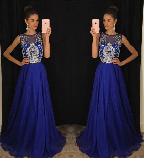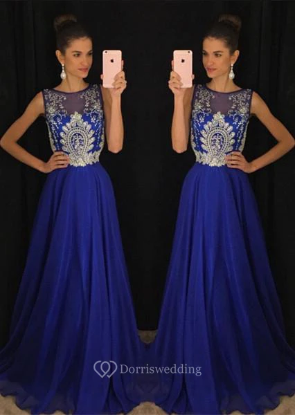 Gorgeous Dark Royal Blue Sleeveless Evening Dresses Long Chiffon With Appliques Beadings