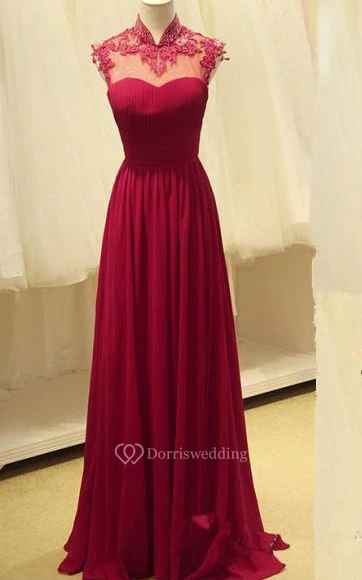 Gorgeous High-Neck Burgundy Long Prom Dresses Chiffon Beadings Appliques