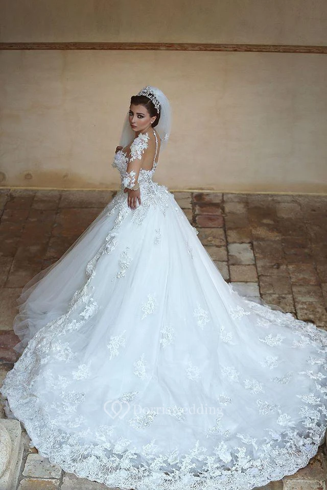 Gorgeous Long Sleeve Appliques Tulle Wedding Dress Hi-Lo With Train