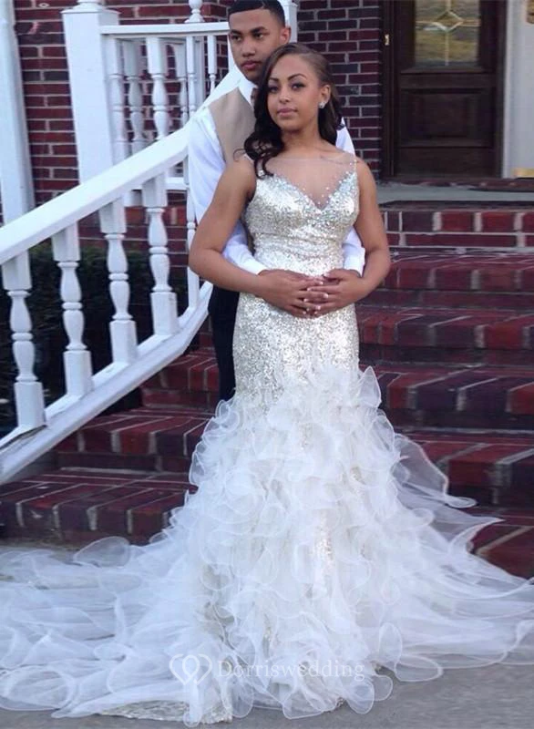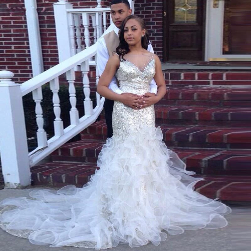 Gorgeous Sleeveless Sequins Prom Dresses Mermaid Tulle Evening Gowns