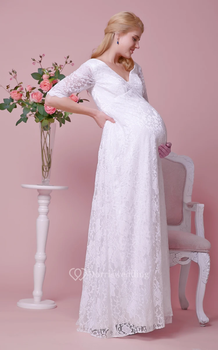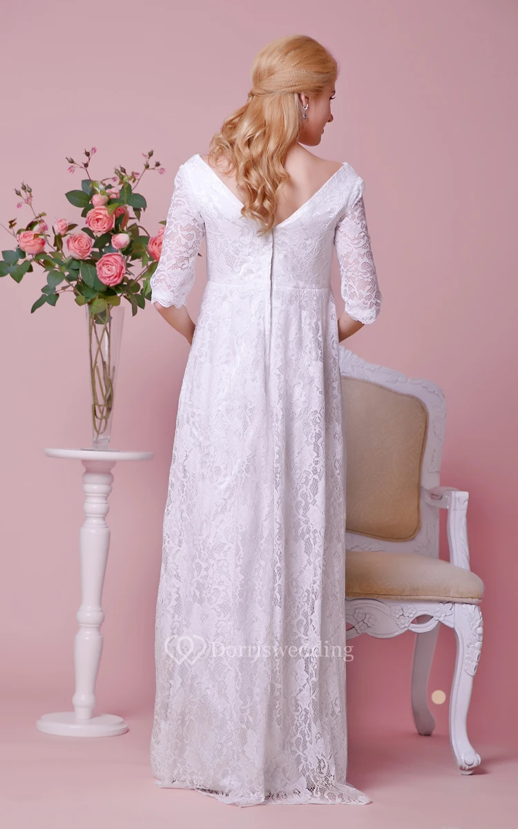 Graceful Low-v Neck 3-4-sleeved Lace Long Dress