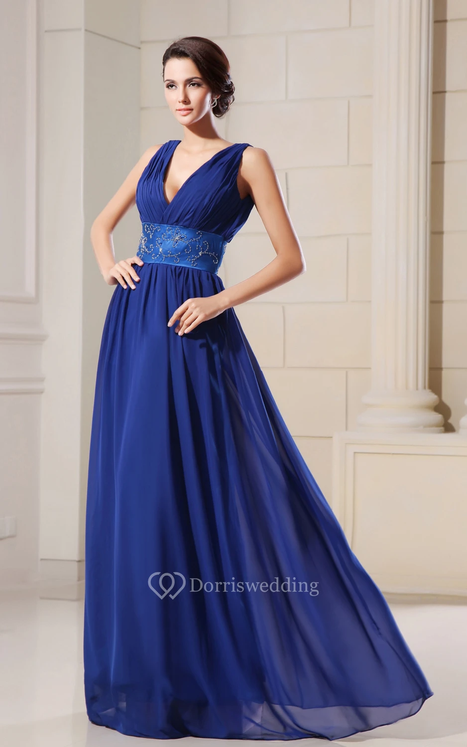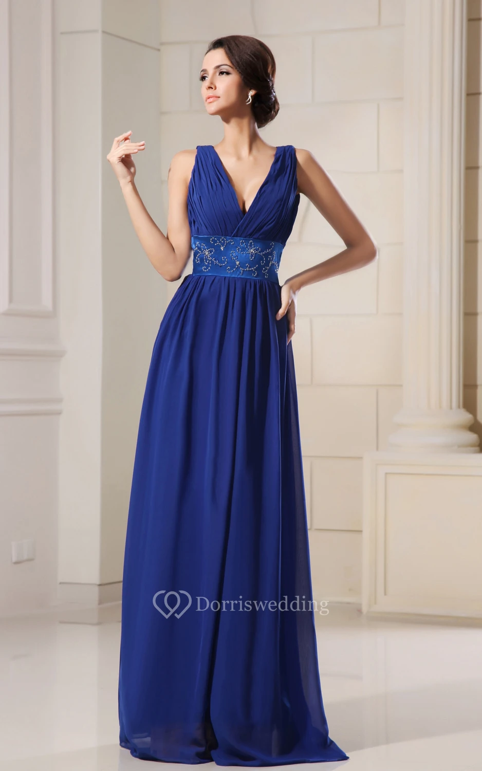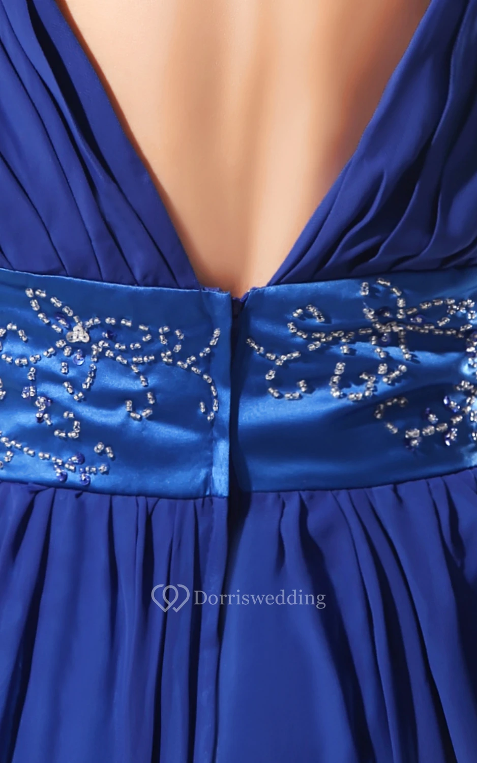 Graceful Low V-Neck Empire Chiffon A-Line Gown Has Beading Waist